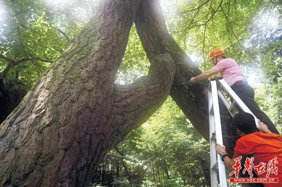 8月19日,长沙市岳麓山风景区,园林工人在检查一株原来加固过的古松树。 记者 田超 摄