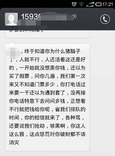 对此,王女士称:“我想他肯定是不想给钱,我只能骂骂他出气。”而游客也在短信中辱骂王女士,由一点误会引发的矛盾迅速升级。后来,王女士的几位朋友也都曾发短信劝当事游客,但无济于事。