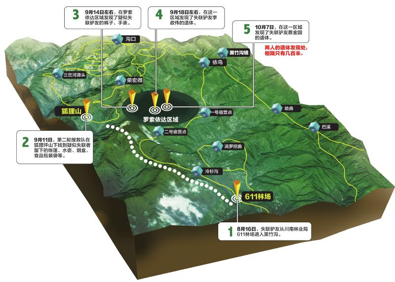 左右,第三轮搜救队伍在罗索依达区域发现了一具遗体。但由于所带给养即将耗尽,且不具备现场勘验资质,救援人员撤出了黑竹沟。