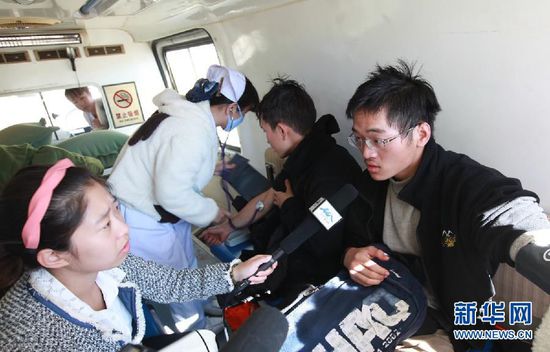10月7日,两名获救大学生在接受医疗检查。 7日7时10分,经过吉林省长白山管委会组织近百人搜救队16个小时的艰苦搜寻,在长白山原始森林中迷失的两名大学生终于获救。经检查,二人目前身体状况和精神状态良好。