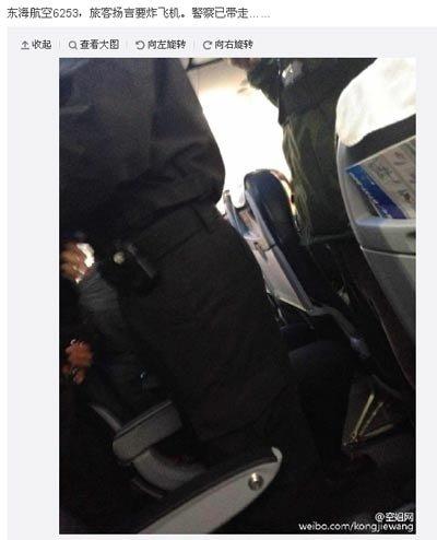 爆料微博发出约十几分钟后,被实名认证的东海航空公司官微转发,同时评论称,机组成员已妥善处理并配合警方中止了该名旅客及其同行人员的行程。航空公司官微还称,上述男子被警方带离飞机并做相关调查。“机场部门与机组已经对飞机全部进行清舱并未发现有任何可疑物品或爆炸物。”