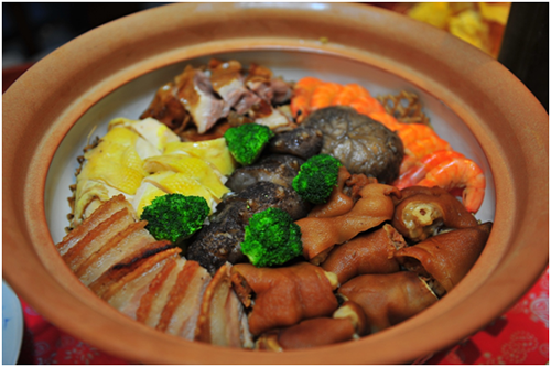 客家最有名的客家大盆菜。客家大盆菜的制作十分考究,是将海参、鸡、鸭、虾、腐竹、萝卜、香菇等十几种原料,分别经过煎、炸、煮、焖、卤后,再层层装入木盆里。配上秘谷特制的酱料与自酿米酒,一家人围坐一桌,几双筷子在盆里翻找,越吃到下层越美味。客家大盆菜也有团圆、祥和之意,万事顺遂,这也正是龙岩冠豸秘谷佰翔度假酒店送给来店客人的美好祝福。