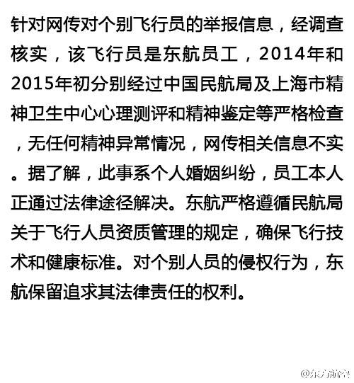 东航方面于3月9日晚通过微博对此事做出官方回应称,针对网传个别飞行员的举报信息,经调查核实,该飞行员是东航员工。2014年和2015年初分别经过中国民航局及上海精神卫生中心心理测评和精神鉴定等严格检查,无任何精神异常情况,网传相关信息不实。据了解,此事系个人婚姻纠纷,员工本人正通过法律途径解决。