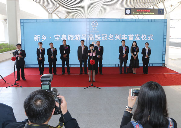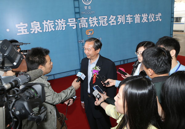 在仪式上,河南省旅游局副局长李宗军、宝泉旅游度假区上属春江集团副总裁张洪梅等剪彩并讲话。李宗军在接受采访时表示, 宝泉是新乡近两年打造的一张新名片,自然景观上乘。冠名高铁列车是一个非常好的推广方式,宝泉的发展将会进一步激活新乡旅游产业,进而起到调整产业结构、带动区域经济发展的作用。