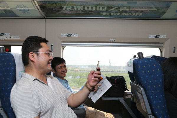 “这是哪里?”一位女乘客对小桌板背后的图片表示出浓厚兴趣,然后掏出手机扫描了二维码。