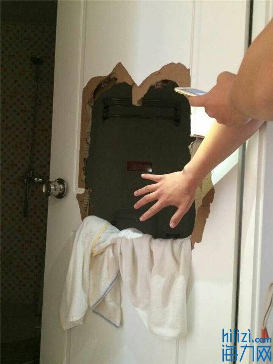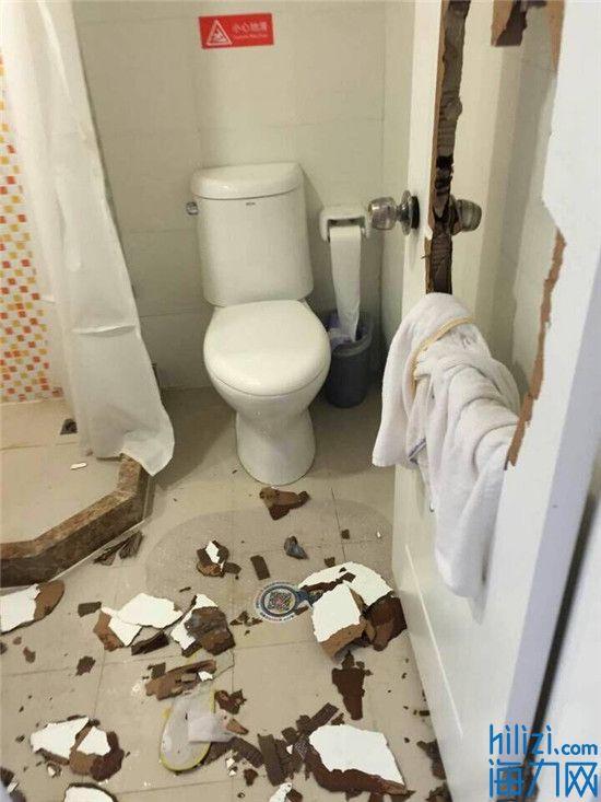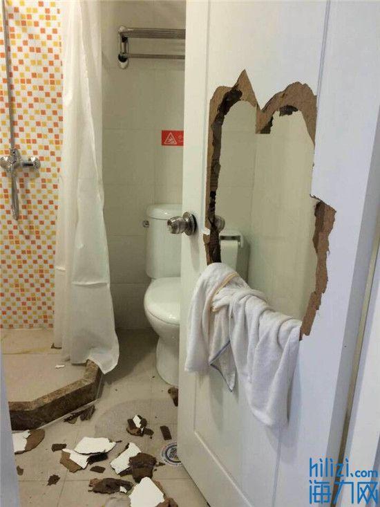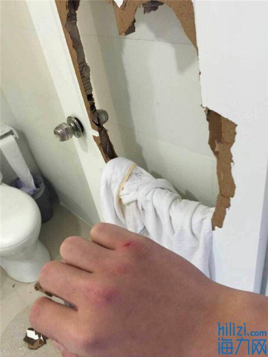 9日下午2点10多分许,本报接到读者爆料称,在大连黄河路一家酒店住宿时遭遇惊魂事件,情侣两人在卫生间内洗漱的时候,卫生间的门打不开了,呼唤求助的不到回应的情况下,男士只能赤手空拳试图将复合板的房门砸碎,手脚并用,持续了40多分钟,终于掏出能容一个人爬出去的洞。
