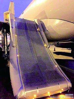 舱门打开飞机逃生滑梯弹出。