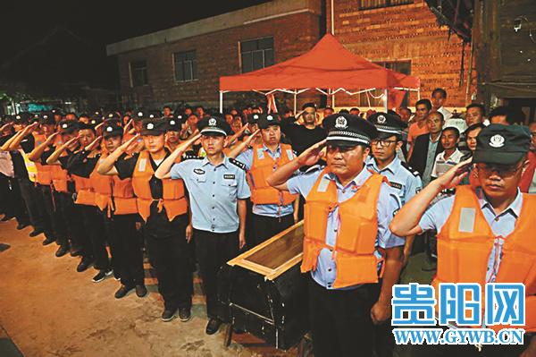 6月11日17时,搜救队在盘江镇卡榜河边一弯道处发现了陈开元老人的遗体,民警们将警服脱下,盖在没有任何衣物遮挡的遗体上,用警车将遗体送回,全体民警列队敬礼。