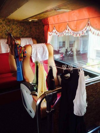 大陆还自备晒衣绳夹,俨然把整个游览车当成自己的晒衣场。