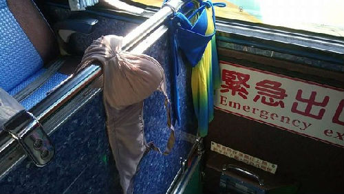 大陆游客直接在游览车上晾晒内衣。