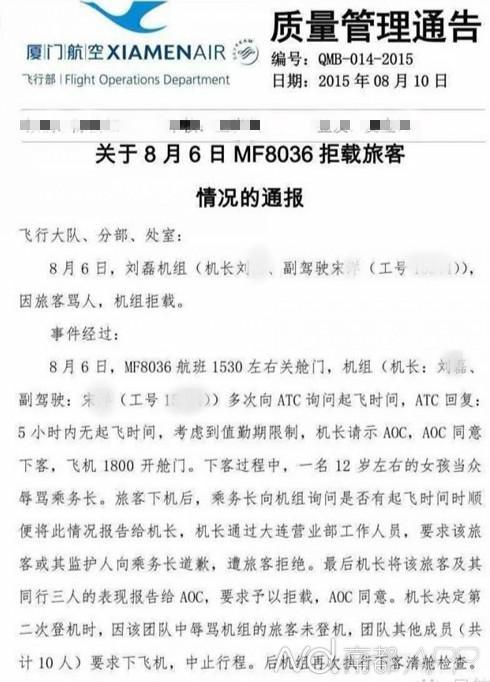 昨日,厦航在《MF8036拒载旅客情况通报》中叙述了事发经过。通报称,8月6日15时30分许,MF8036机长询问ATC(航空交通管制)得知5小时内无起飞时间,ATC同意下客。下客时,一名12岁左右的女孩当众辱骂乘务长,反馈后机长要求该旅客或监护人向乘务长道歉遭拒。机长请示ATC后对方同意拒载。