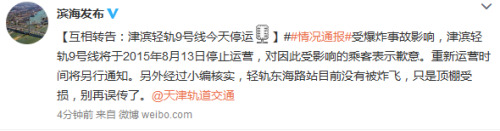 据天津市滨海新区政府官方微博消息,受爆炸事故影响,津滨轻轨9号线将于2015年8月13日停止运营,对因此受影响的乘客表示歉意。重新运营时间将另行通知。