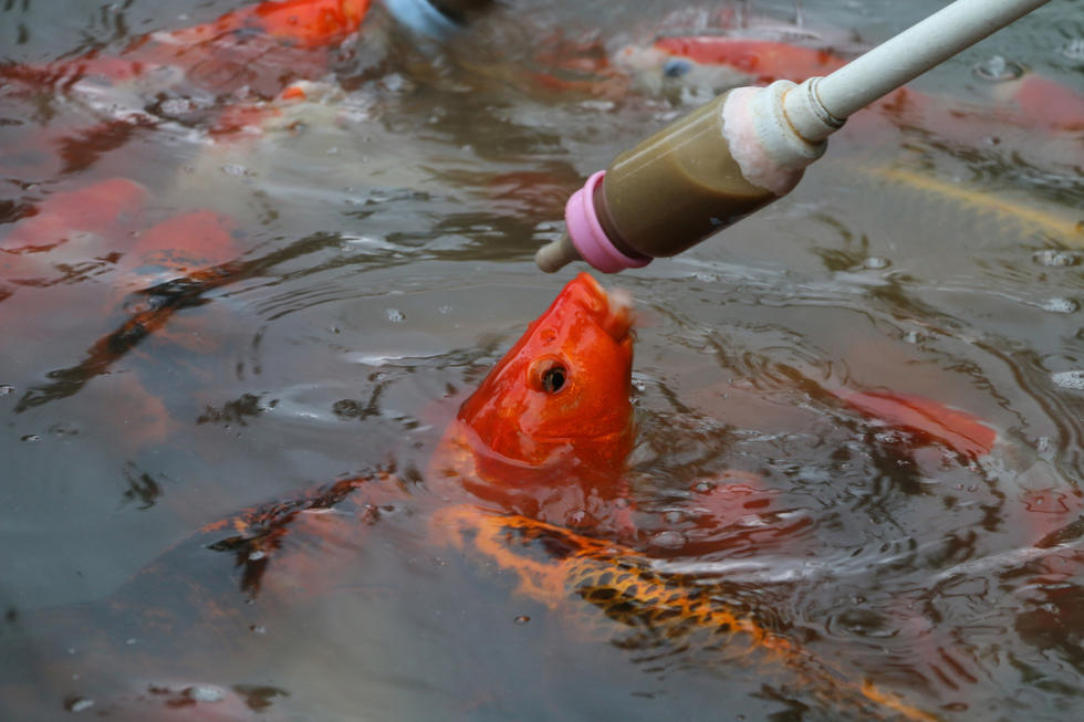 2015年08月20日,安徽省合肥市,逍遥津公园湖面长廊上的用奶瓶给金鱼喂食的娱乐项目,吸引众多游客参与。奶瓶喂鱼是将鱼食制成液体装入奶瓶内喂食金鱼,新奇有趣的喂食方法吸引众多家长带着孩子的亲子游客参与。驻足观看的游客感叹“城会玩”。图为一只金鱼头跃出水面“喝奶”。