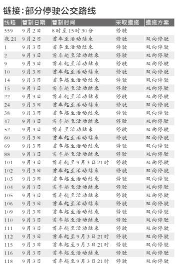 记者从公交集团获悉,9月2日至9月4日期间,公交集团260条线路在交通管制期间将采取停驶、绕行、甩站、区间、提前末班车等措施。