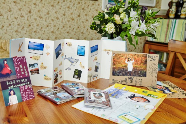 孩子正在把打印出来的照片DIY成明信片,用来在旅途中结交新朋友