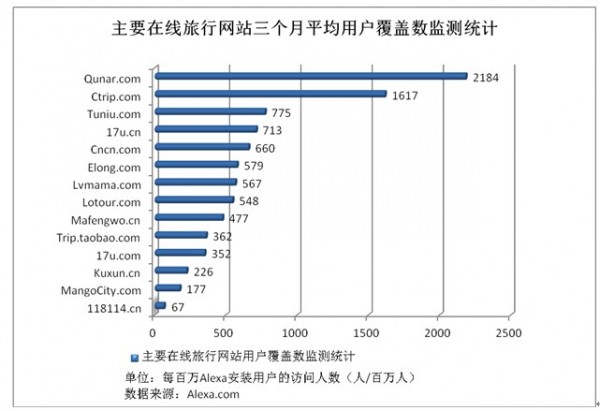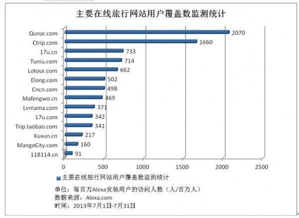 图2:主要在线旅行网站三个月平均用户覆盖数(5月份-7月份)