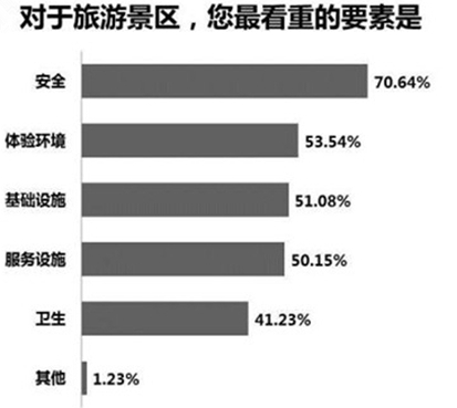 据中消协提供的《中国消费者协会2013年旅游餐饮调查报告》显示,消费者对于景区各要素的重视程度依次为:安全70.46%、体验环境53.54%、基础设施51.08%、服务设施50.15%、41.23%,其中景区安全连续两年成为消费者最看重的因素。
