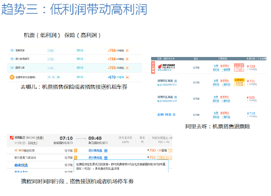 越是标品,利润越低。单纯靠标品的利润,谁都过得不好。机票领域现在已经是哀鸿遍野了,那为什么同程和途牛还要高调宣布进军机票和酒店领域呢?其中的主要的逻辑就是,这些标品虽然利润低,但是会带来流量,有了流量就可以根据信息维度和销售难易程度搭售其它高利润的产品了。窃以为,机票搭售的顺序是:保险>租车>酒店>接送机等。