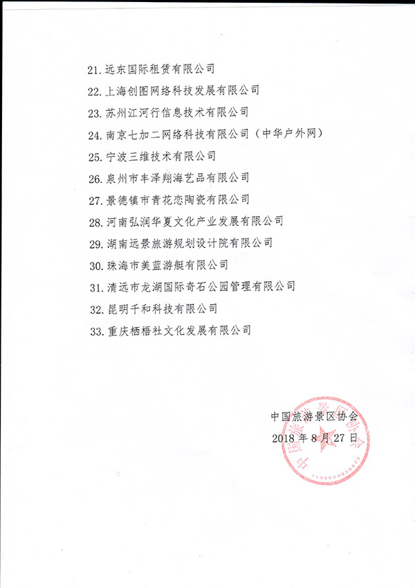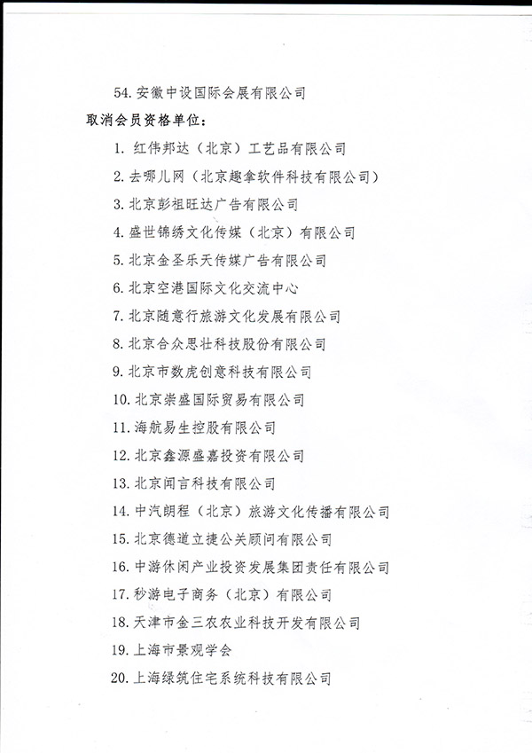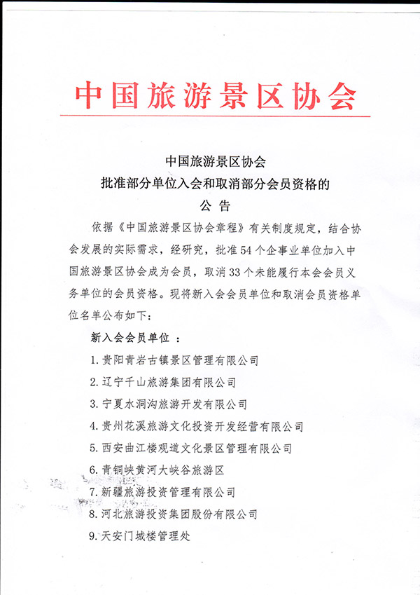 据中国旅游景区协会消息,依据《中国旅游景区协会章程》有关制度规定,结合协会发展的实际需求,贵阳青岩古镇景区管理有限公司、辽宁千山旅游集团有限公司、宁夏水洞沟旅游开发有限公司等54家企事业单位获中国旅游景区协会会员资格。同时,因未能履行会员义务,红伟邦达(北京)工艺品有限公司、去哪儿网(北京趣拿软件科技有限公司)等33家单位被取消会员资格。具体名单如下: