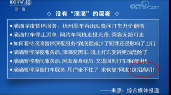 《滴滴消失的第一夜:司机走投无路 乘客也无路可走》的文章,刷爆网络,让不少人以为滴滴深夜暂时停运是官方要求的。央视网发文回怼《滴滴你的小聪明太多!央视新闻<1+1>栏目揭露事情真相》,文章指出,滴滴公司此举涉嫌违规。