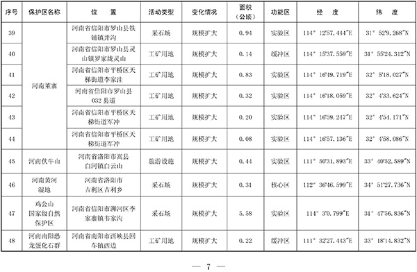 点位数量超过十处的还有河南董寨国家级自然保护区,有8处采石场和5处工矿用地被卫星遥感监测到疑似存在规模扩大现象,有12处位于保护区实验区,1处位于保护区缓冲区。