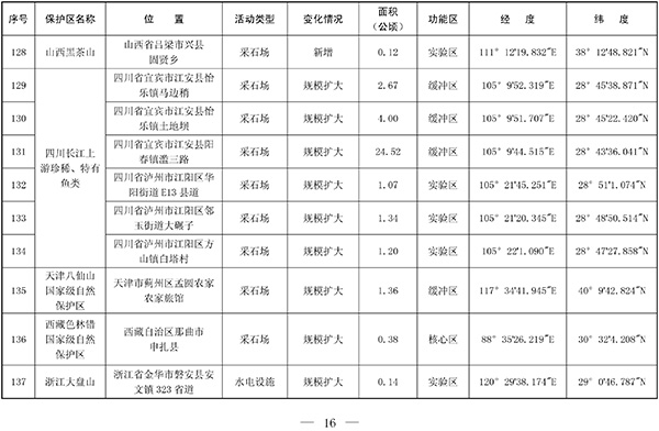 其中安徽扬子鳄、海南省三亚珊瑚礁、河南董寨、黑龙江饶河东北黑蜂、吉林黄泥河、辽宁双台河口、四川长江上游珍稀和特有鱼类等七个国家级自然保护区涉及点位较多。