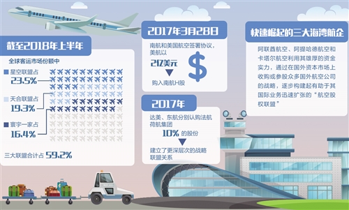 快速崛起的三大海湾航企——阿联酋航空、阿提哈德航空和卡塔尔航空利用其雄厚的资金实力,通过在国外资本市场上收购或参股众多国外航空公司的战略,逐步构建起有助于其国际业务迅速扩张的“航空股权联盟”,航空公司成员可以进行联合培训、集中采购,从而实现规模效益,降低成本,并在对外上实现服务资源共享,共建销售渠道。在国内,11月12日,东航宣布入股星空联盟的吉祥航空,双方实现互相持股。在綦琦看来,“股权联盟”不是最终的合作方式,还会有新的合作模式涌现。