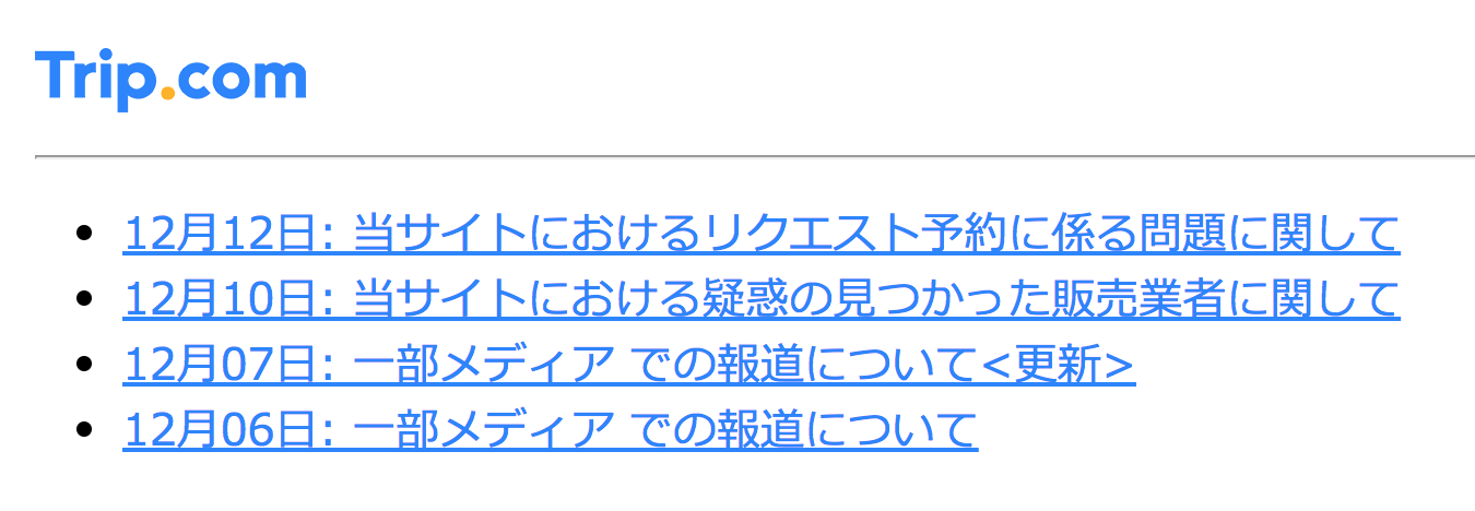 近日,针对日媒曝出携程日本网站Trip.com上逾400份酒店订单属于“空售”这一情况,携程遭到了日本观光厅的调查。截至12月12日,携程就此事共发布了4份声明,并对权益受损害的消费者给出了赔偿方案。