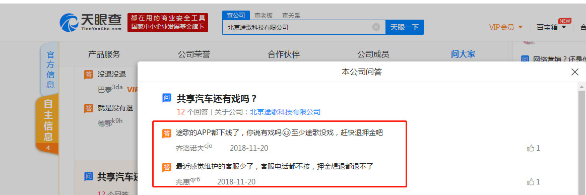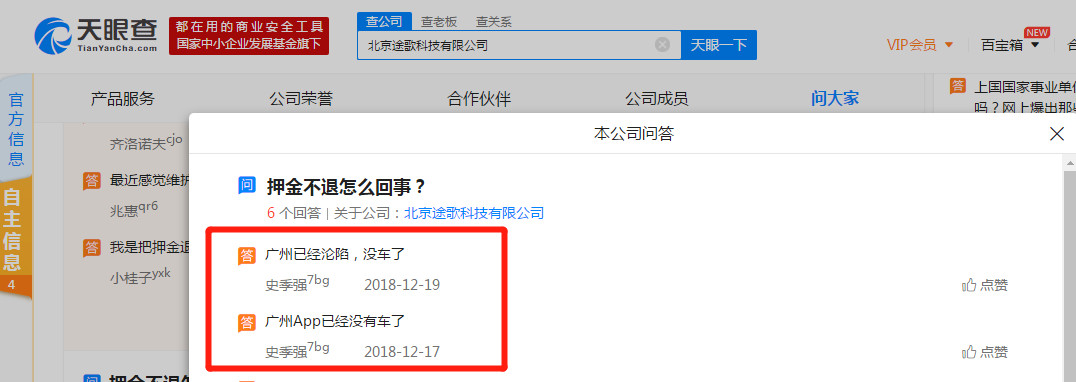 既然退不了钱,不然就先用着?可根据多位网友爆料,途歌的服务目前已经无法正常使用,多个城市根本无车可用。天眼妹在天眼查中途歌公司的问大家模块也发现了不少途歌用户的吐槽。