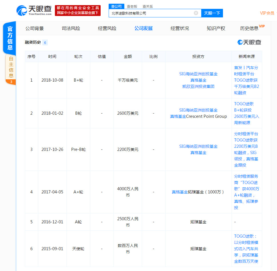 途歌其实已经算是共享汽车行业中的佼佼者,根据天眼查信息,途歌成立于2015年,但在短短3年的时间中,途歌已经完成了6次融资,就在今年10月,途歌还刚刚获得了一笔千万美元级别的融资款,并在获得新融资的同期就在北京推出送车上门的服务,现在被爆出现严重现金流问题,难道是不到2个月就把钱花完了?