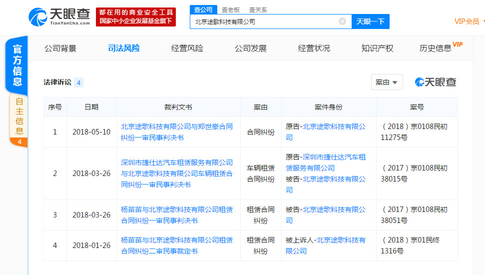 更糟糕的是,小黄车黄了,好歹还能剩下大量的自行车这一固定资产,途歌的奔驰却大部分是从租赁公司那里租来的,这也就意味着,一旦业务盈利不佳,资金链紧张,汽车租赁公司收不回来账终止合作,途歌就会陷入没钱—没车—用户离开—继续没钱—继续没车的死循环中没法挣脱。天眼妹注意到,目前途歌有多起法律纠纷与汽车租赁公司有关。