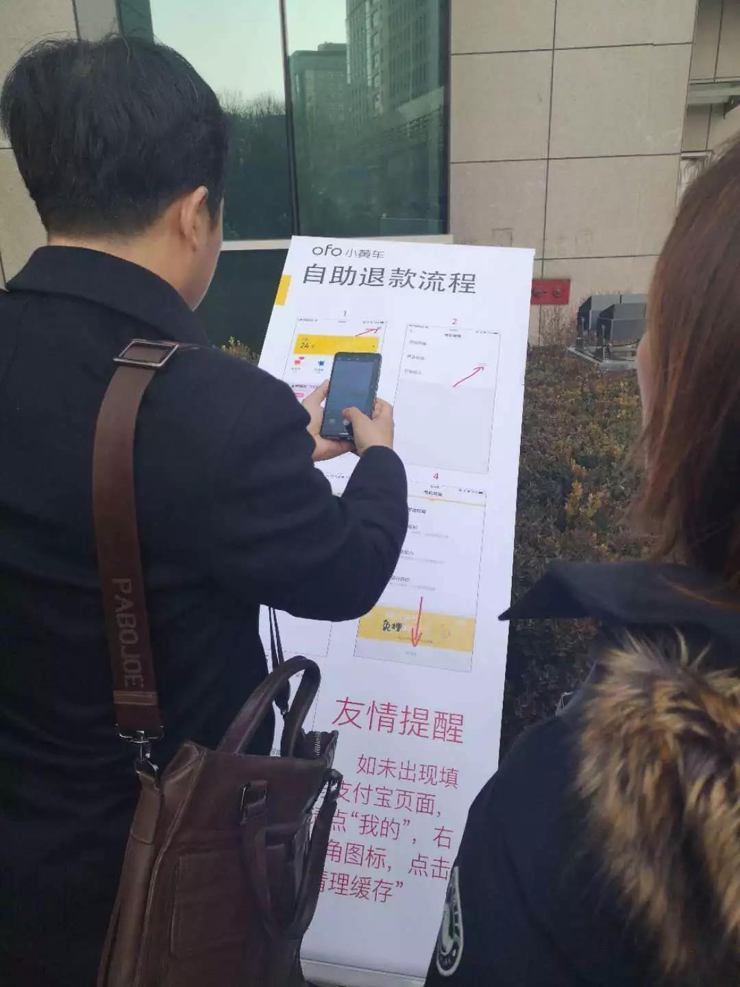 12月19日下午,《法制日报》记者来到ofo总部所在的中关村互联网金融中心,看到有百余人在排队退押金,大厦门前还放置数个自助退款流程易拉宝。工作人员在现场发放手机退款说明,称现场也是扫码排号,没有任何特权。
