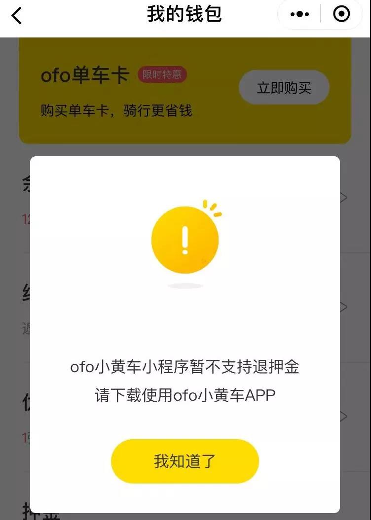19日,记者试着用手机在线上将ofo的99元押金退回,微信小程序显示不支持退押金需下载使用ofo小黄车APP。