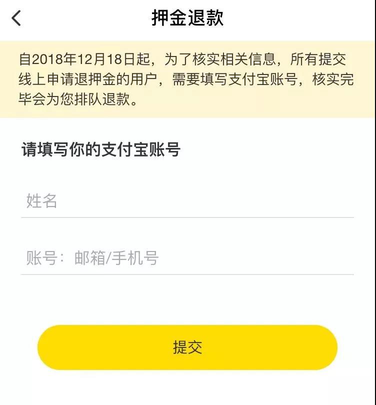记者又登录ofo小黄车APP,再次选择退押金,页面显示,自2018年12月18日起,若要退款需要核实并排队退款,需要输入姓名和支付宝账号。比起交押金时的秒入,退押金可谓大费周章。