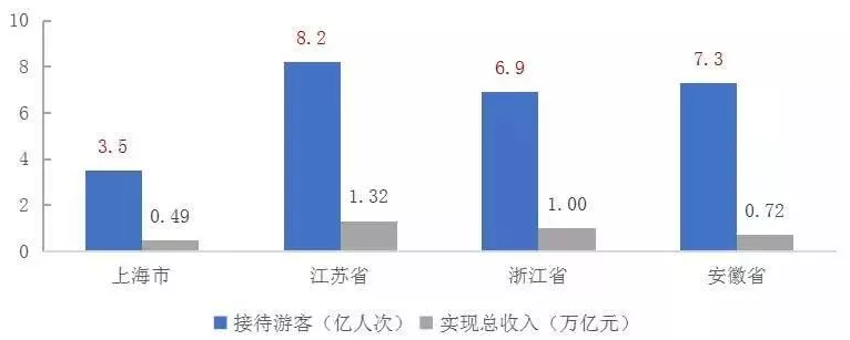 长三角地区不仅是我国经济重地,也是文旅产业最发达的地区之一。区域内文旅资源富集、交通网络通达、潜在的消费客群及人员流动的常态性,使得旅游产业在促进长三角区域一体化发展中发挥着重要作用。2018年,长三角三省一市共实现旅游总收入3.54万亿元,占全国比重达69%,市场规模堪称巨大。