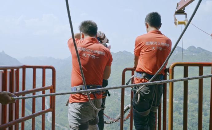 记者头戴摄像机亲身体验高空蹦极。贵州安顺的坝陵河大桥桥面距谷底370米。桥上建有目前世界最高的商业蹦极设施,项目将于10月1日正式对游客开放。