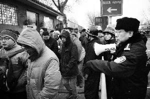 昨天早上7时,路灯才刚刚熄灭,在渐亮的夜色中,紧闭的雍和宫南门从内打开。几名寺院员工和东城分局的执勤民警们站在排队人群的最前面,维持着秩序。前来支援的北京站派出所所长吉喆,拿着一个大喇叭向等待的香客喊着:“待会放行后,大家一定注意脚下安全,不要挤。”随后,四名武警战士手挽着手,走在队伍的最前面以延缓香客进入的速度,以防发生踩踏。