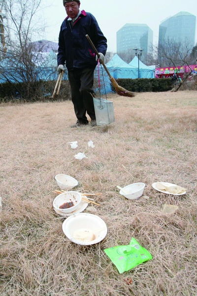 烤串的竹签子,面茶、油茶等一次性勺子,餐巾纸……在厂甸庙会的地面上,零星散落着游客们随手丢弃的垃圾,记者看到尽管庙会上每隔五六米就安置了一个半人高的塑料垃圾桶,可一些游客却视而不见。