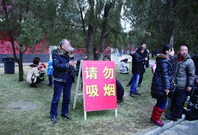 地坛庙会园内禁止吸烟,很多游客却无视这个规定。记者看到,一位老人就在“请勿吸烟”的牌子旁边吸烟。靠着墙的、围在一起的、排队上厕所的,都有人不停地吞云吐雾。