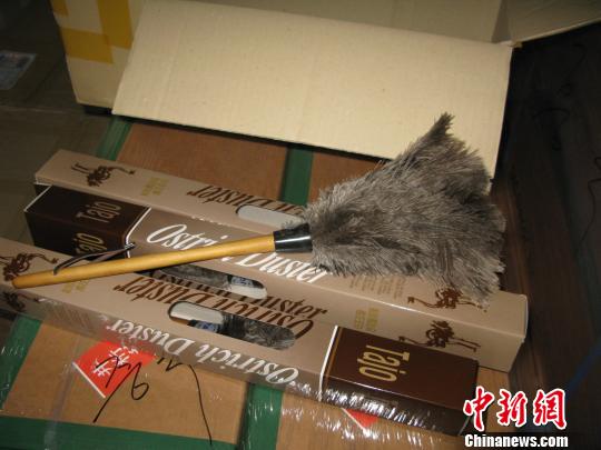 进境检验非常严格,别说中药,就连刷子也不放过,图为检验检疫局在进境集装箱中截获的鸵鸟羽毛制作的刷子 昆检 摄