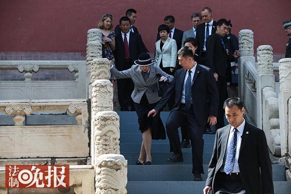 在裬恩殿中,女王仰望着金丝楠木大殿再三询问产地。走出祾恩殿,女王背起双手,轻轻倚靠在祾恩殿的红墙上,笑容可掬地摆起pose让中外记者拍照。