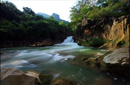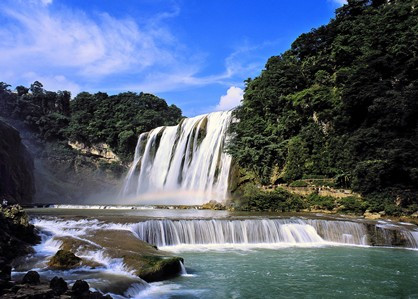 黄果树位于安顺以西45公里,是我国第一批公布的国家重点风景名胜区,国家首批5A级旅游区。景区由著名的黄果树大瀑布及姿态各异的瀑布群、风光旖旎的天星桥、郎弓河,雄峻的灞陵峡谷等景区景点构成。世界名瀑黄果树大瀑布,高77.8米,宽101米,势若银河倾泻,震颤山谷,水花升腾百米之高,艳阳下道道彩虹忽隐忽现,水帘洞横穿大瀑布,万顷白水漫顶而过,置身其间,惊心动魄。大瀑布周围,有落差高达410米的三叠滴水滩瀑布、瀑面宽105米的陡坡塘瀑布、滩面长350米的螺丝滩瀑布及形态秀美的银链坠潭瀑布等,十八飞瀑,洋洋大观。