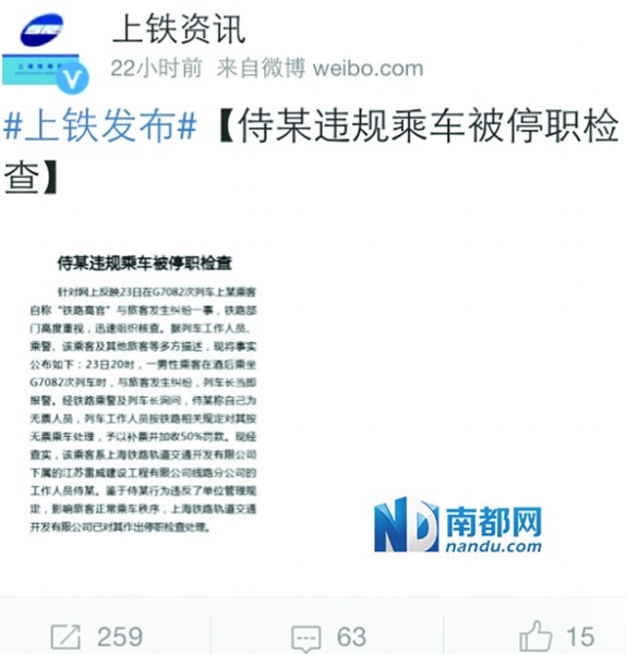 上海铁路局前日在通报中证实了这一说法。通报称,经查实,该局确认侍某“系上海铁路轨道交通开发有限公司下属的江苏雷威建设工程有限公司线路分公司的工作人员”。通报还说,因侍某声称自己无票,已被列车工作人员按相关规定予以补票并加收50%罚款。此外,鉴于侍某违反了单位管理规定,影响乘客正常乘车秩序,上海铁路轨道交通开发有限公司已对侍某作出停职检查处理。从最新的通报看,侍某显然并非此前官方通报中的“不在铁路部门工作”。