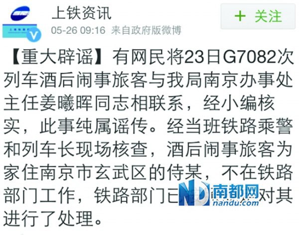 随后,有网友经网络搜索,一度猜测这位占座的铁道系统“领导”,是上海铁路局南京铁路办事处主任姜曦晖,但这个猜测很快被上海铁路局方面否定。在5月26日的微博通报中,上海铁路局发布“重大辟谣”,称经过当班铁路乘警和列车长的现场核查,酒后闹事旅客为家住南京市玄武区的侍某,不在铁路部门工作,将其与南京铁路办事处主任兼上海铁路局副局长姜曦晖联系起来,“纯属谣传”。
