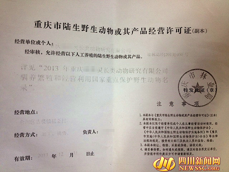这家公司饲养小熊猫是否有合法手续?随后,四川新闻网记者联系上重庆硕斯灵长类动物研究有限公司负责人叶先生。据其介绍,公司能提供饲养、展览小熊猫的所有许可证。昨日接受成都森林公安调查时,该公司已经提交过相关合法证件。