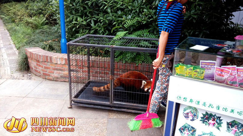 工作人员刚打扫完小熊猫的笼子