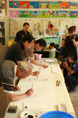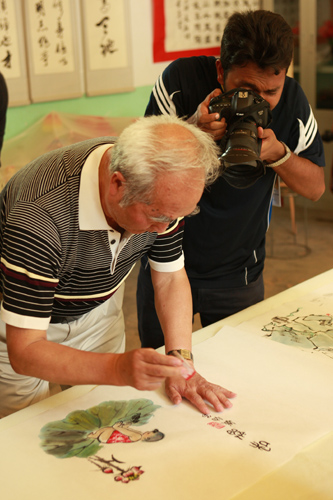 美国人Kurt Robert Nabl一边感受着中国西部民风,眼睛一边随着漫画家画笔移动,不时感叹道“不可思议,葵花也可以作为漫画元素,太有创意了”。两天来他经常被当地民众拉去合影拍照,他一面微笑着极力配合,一面笑着说“这里民众真亲切”。