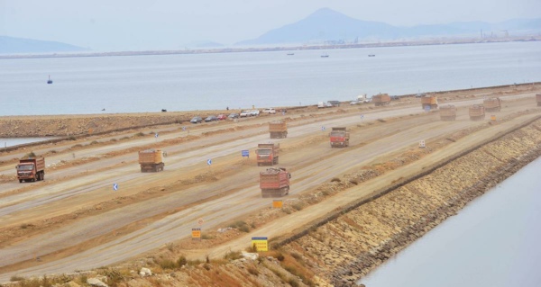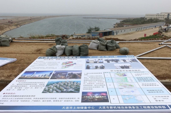 2014年9月14日,辽宁省大连市甘井子区北部的大连新机场建设工地,众多重型卡车往返山海之间,将附近挖山的土石方填到海里造机场。而大连新机场的总平面图(概念性规划)、新机场沿岸商务区——概念性总体规划等图于当日亮相。