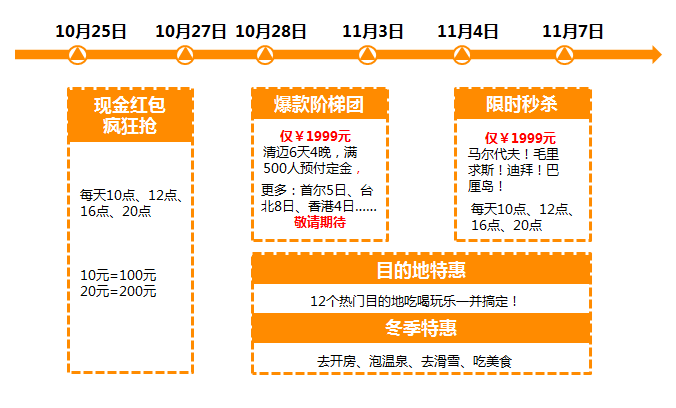 本次“1999元封顶,玩遍全球“活动相较于今年6月份第一季,产品线更为丰富、运维更成熟,亮点颇多着实让人惊喜。活动正式启动前的预热已让人难以抵抗,10月25日至27日的4个整点限量放送现金红包,以十挡百,这种甜蜜诱惑太心动。