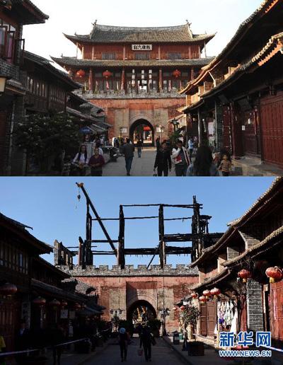 云南巍山古城拱辰楼火灾前后对比图。新华社记者蔺以光摄